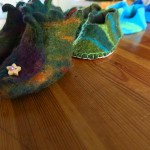 Faire des chaussons en laine feutrée réunit tout ce je que j’aime : les couleurs, la matière soyeuse, l’effet du hasard dans la superposition des couleurs, l’aspect physique et sculptural du travail .