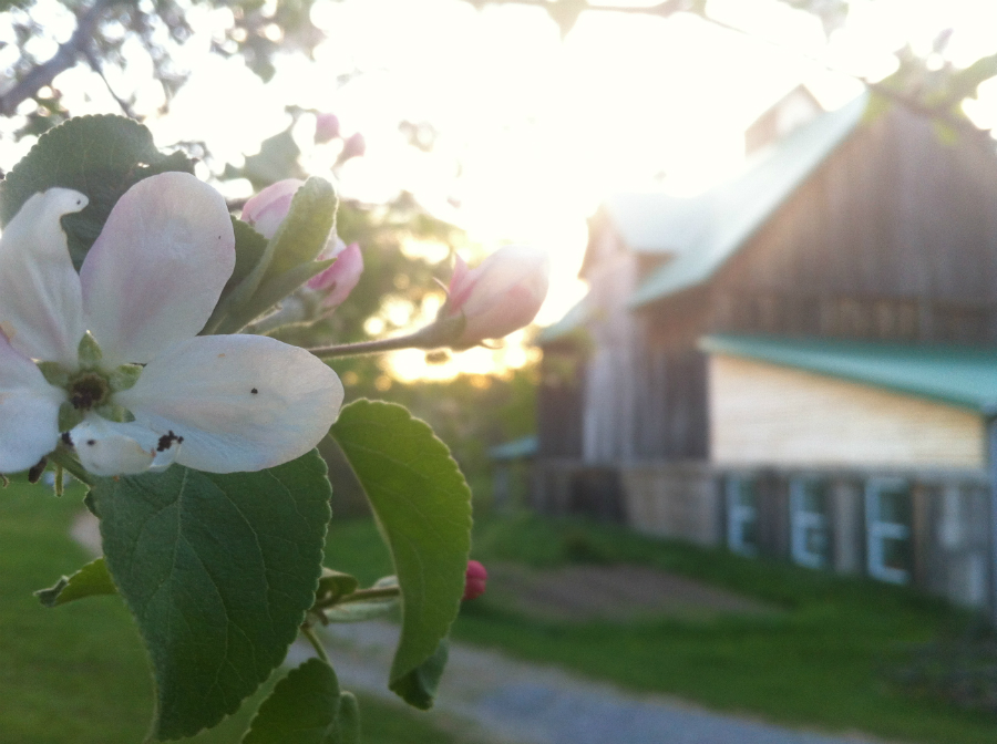 Verger en fleurs avec vue sur la grange